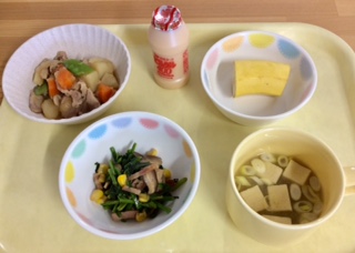 肉じゃが・ほうれん草の炒め物・バナナ・乳酸菌飲料・高野豆腐のみそ汁