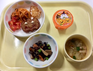 かぼちゃのハンバーグ・れんこんチップス・ナポリタン・ひじき煮・パンプキンババロア・ベーコンとキャベツのスープ
