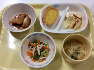 煮魚・ささみの和風和え・コーングラタン・りんごとバナナ・ワカメと卵のみそ汁
