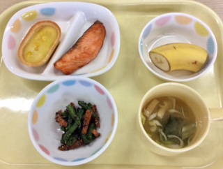 焼き鮭・コーングラタン・いんげんのごま和え・バナナ・玉ねぎとわかめのみそ汁