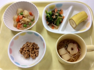 ツナじゃが・きのこ入りお浸し・納豆・バナナ・そうめん汁