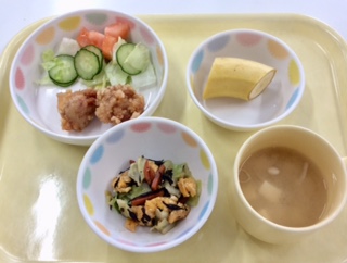 鶏のから揚げ・ひじきと卵の炒め物・バナナ、豆腐のみそ汁