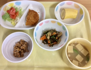 かぼちゃコロッケ・納豆・切り昆布煮・バナナ・高野豆腐のみそ汁