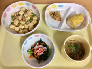 マーボー豆腐・チヂミ・中華風浸し・バナナ・春雨スープ