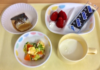 サバのみそ煮・キャベツと卵の炒め物・味付けのり・いちご・牛乳