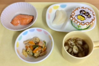 献立は、焼き鮭・白菜の炒め煮・梨・プリン・芋煮 です🤗✨